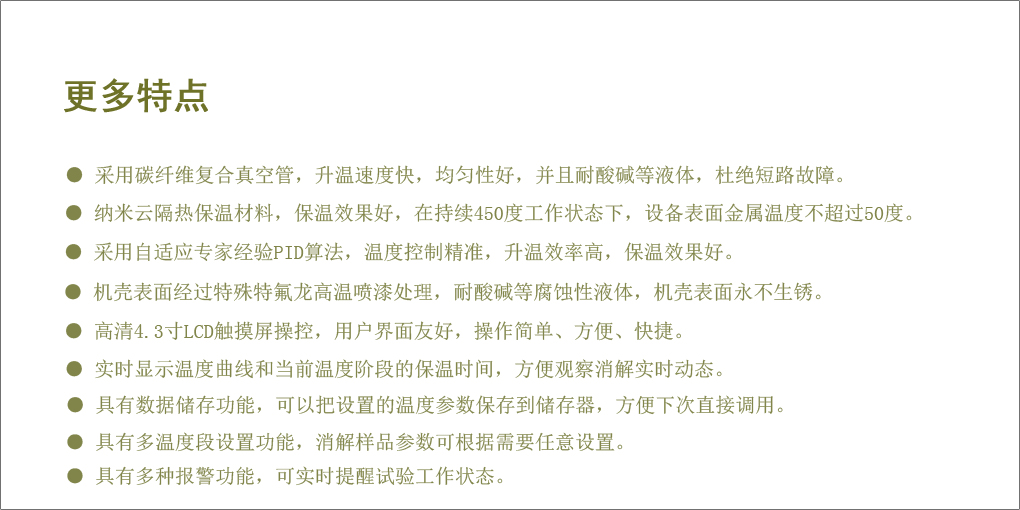 首次采用碳纖維復合真空加熱技術,升溫效率高,溫度均勻性好。采用行業領先的納米云隔熱材料,熱效率高,節能環保。更具有4.3寸高清LCD觸摸屏操控界面,簡單易懂,并具實時顯示溫度曲線功能,摒棄了以往溫控表頭繁瑣的操作。 XTG5000適用于食品、醫療、農業、林業、生化等行業已經高等院校、科研部門對種子、土壤、植株、飼料、礦石等化學分析之前的樣品消解處理 |